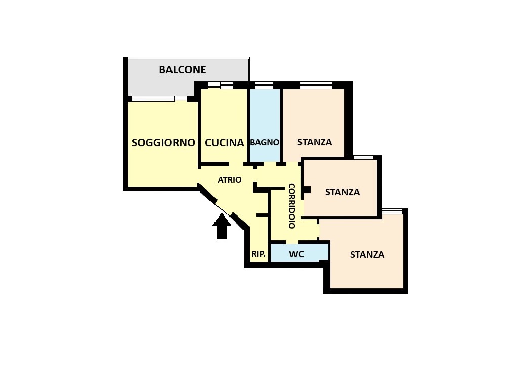 ELENCO VANI: ingresso/atrio, corridoio, 3 camere da letto, soggiorno, cucina abitabile, un balcone, un bagno finestrato, un WC , un ripostiglio , cantina.