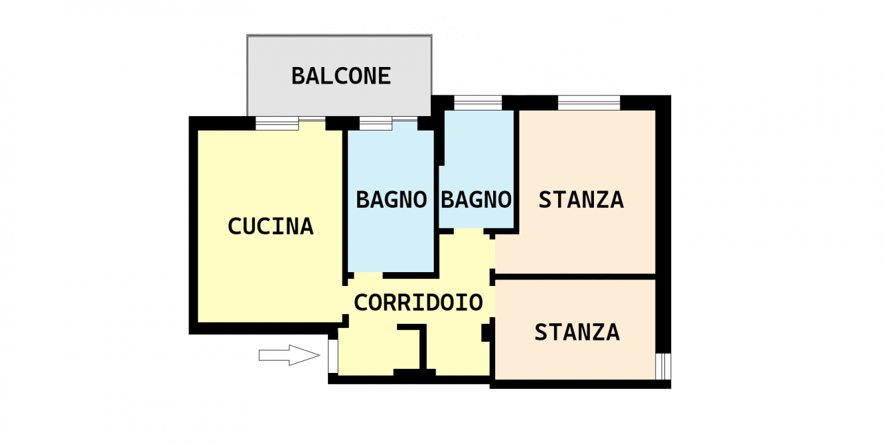 ELENCO VANI: L'appartamento è composto da due stanze, cucina abitabile ,2 bagni finestrati, corridoio, , cantina e un balcone.
